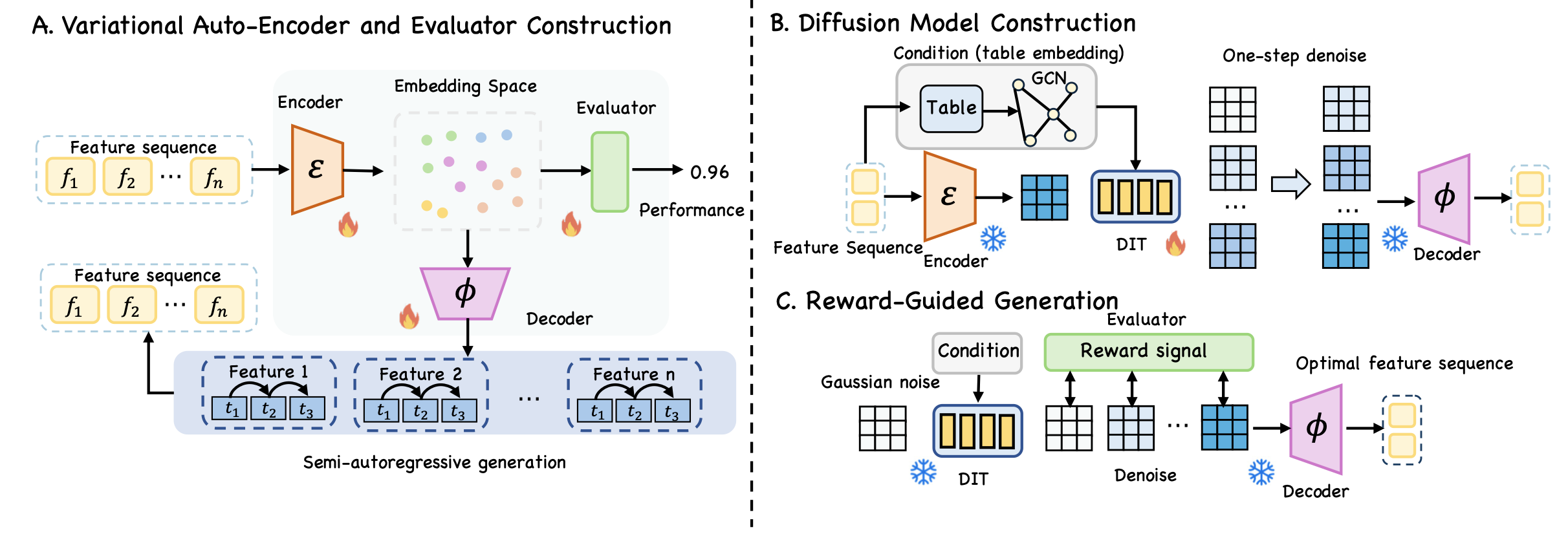We propose a reward-guided semi-autoregressive diffusion model to generate feature transformation functions that optimize downstream task performance.